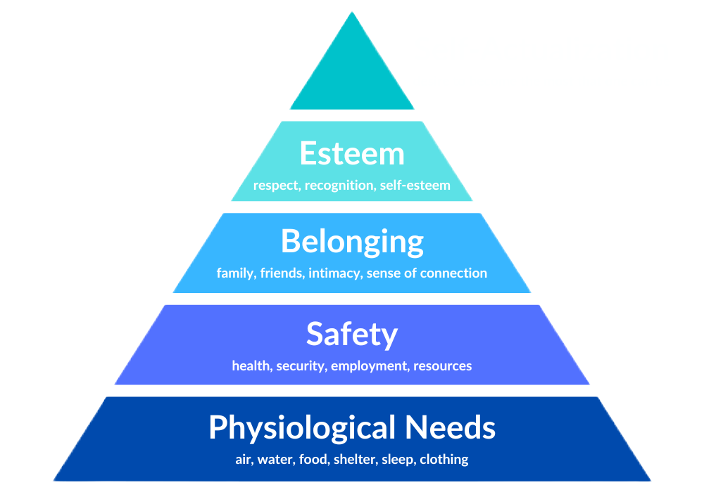 Maslow’s hierarchy of needs is a model for understanding the motivations for human behavior. It maps different motivations onto a pyramid, with each level representing a different human need. These include physiological needs, safety, love and belonging, esteem, and self-actualization. Source: https://www.medicalnewstoday.com/articles/maslows-hierarchy-of-needs